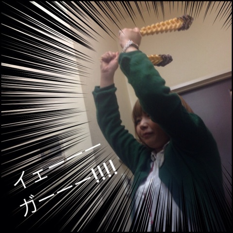 おもしろい形(剣!!?)のワッフルがありましたので、振りかざしてみました(^ω^)…とまぁ、何かと、一部スタッフがハマる「進撃の巨人」を意識した内容でお贈りしました!!